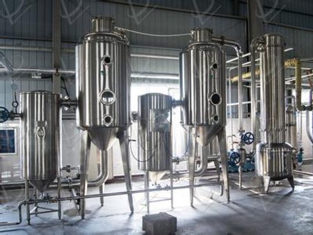 將料液加熱上升,從噴管噴入蒸發(fā)室,進行汽液分離,其料液從循環(huán)管回到加熱室下部再加熱,料液受熱又噴入蒸發(fā)室開成循環(huán)。單效濃縮器料液濃縮到規(guī)定的程度,經(jīng)取樣確定合格后由出料口出料,蒸發(fā)室蒸發(fā)出來的蒸汽經(jīng)除沫器消除泡沫再經(jīng)汽液分離器,部份料液返回蒸發(fā)室,其余二次蒸汽由冷凝器與冷卻器冷卻成液體進入貯液桶,讓不凝氣體排入大氣或真空泵帶走。
